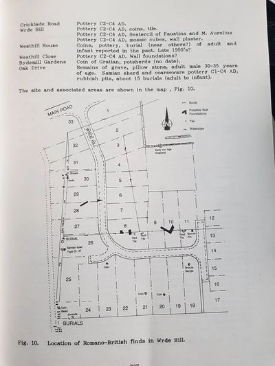 Collins specifically records on a map the presence of what he describes as “a formal [Roman] burial area at the end of Roman Way…and Botany Farm” showing the exact locations of fifteen specific Roman graves discovered during the building of modern houses on the Wrde Hill estate. These are immediately adjacent to the present day Roman Way and Wrde Hill roads and one may speculate that, with Highworth’s Roman history spanning more than 300 years, many, many more formal graves must sit under the ground of the upper half of Highworth’s Old Golf Course.